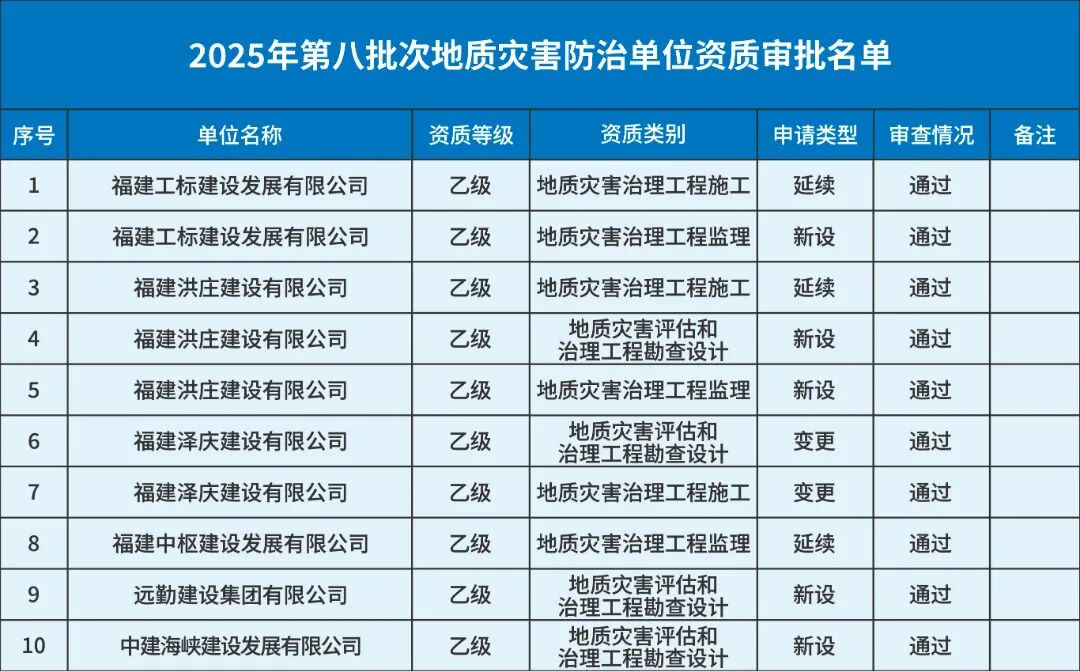 根据《地质灾害防治条例》(国务院令第394号)、《地质灾害防治单位资质管理办法》(自然资源部令第8号)、《自然资源部关于〈地质灾害防治单位资质管理办法〉有关事项的公告》(2022年第97号)、《自然资源部办公厅关于贯彻落实〈地质灾害防治单位资质管理办法〉的通知》(自然资办函〔2022〕2512号)和《福建省自然资源厅关于做好地质灾害防治单位资质审批工作的通知》(闽自然资发〔2022〕82号)等有关规定,我厅组织开展2025年第八批地质灾害防治单位资质申请受理审查工作。经审查并公示,共对6个地质灾害防治单位提交的10个乙级资质申请予以通过,现予公告。