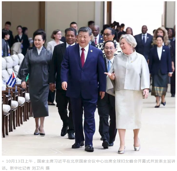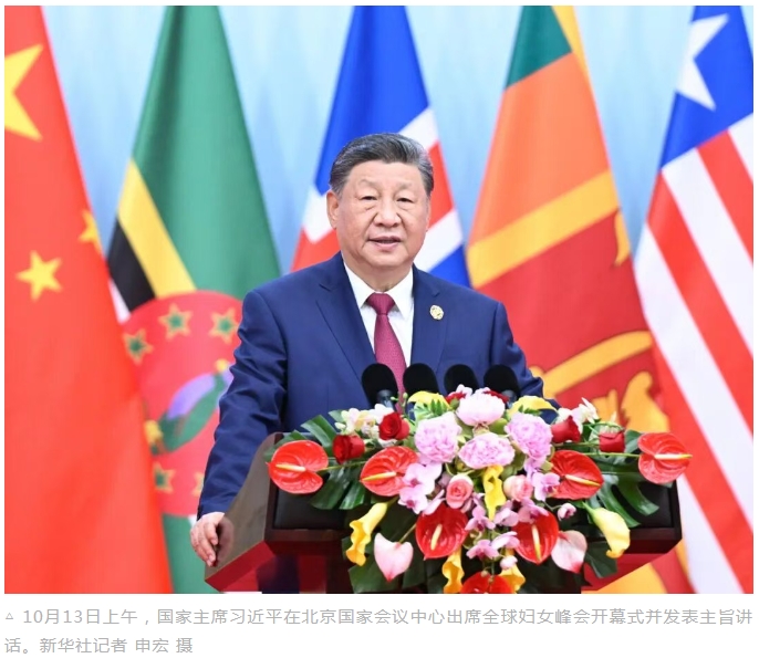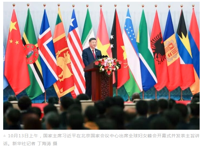 10月13日上午,国家主席习近平在北京国家会议中心出席全球妇女峰会开幕式并发表主旨讲话。