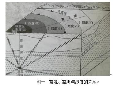(3)烈度:地震时地面受到的影响或破坏程度;我国的地震烈度表将地震烈度分为12度,对于抗震设防烈度等于或大于6度的建筑物,应进行场地与地基的地震效应评价;基本烈度代表一个地区的最大烈度;如图一所示:烈度的大小不仅与震级有关,还与震源深浅、震中距、地质构造等有关。