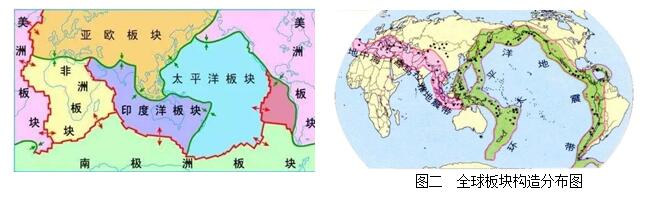 3、根据全球板块构造分布(图二)及地震带分布(图三)可知:各地震带与板块的交接部位及大洋板块中脊完全一致、地震容易发生在活动断裂带地区。已有资料表明分布于洋中脊的地震特点是震源浅而震级小。