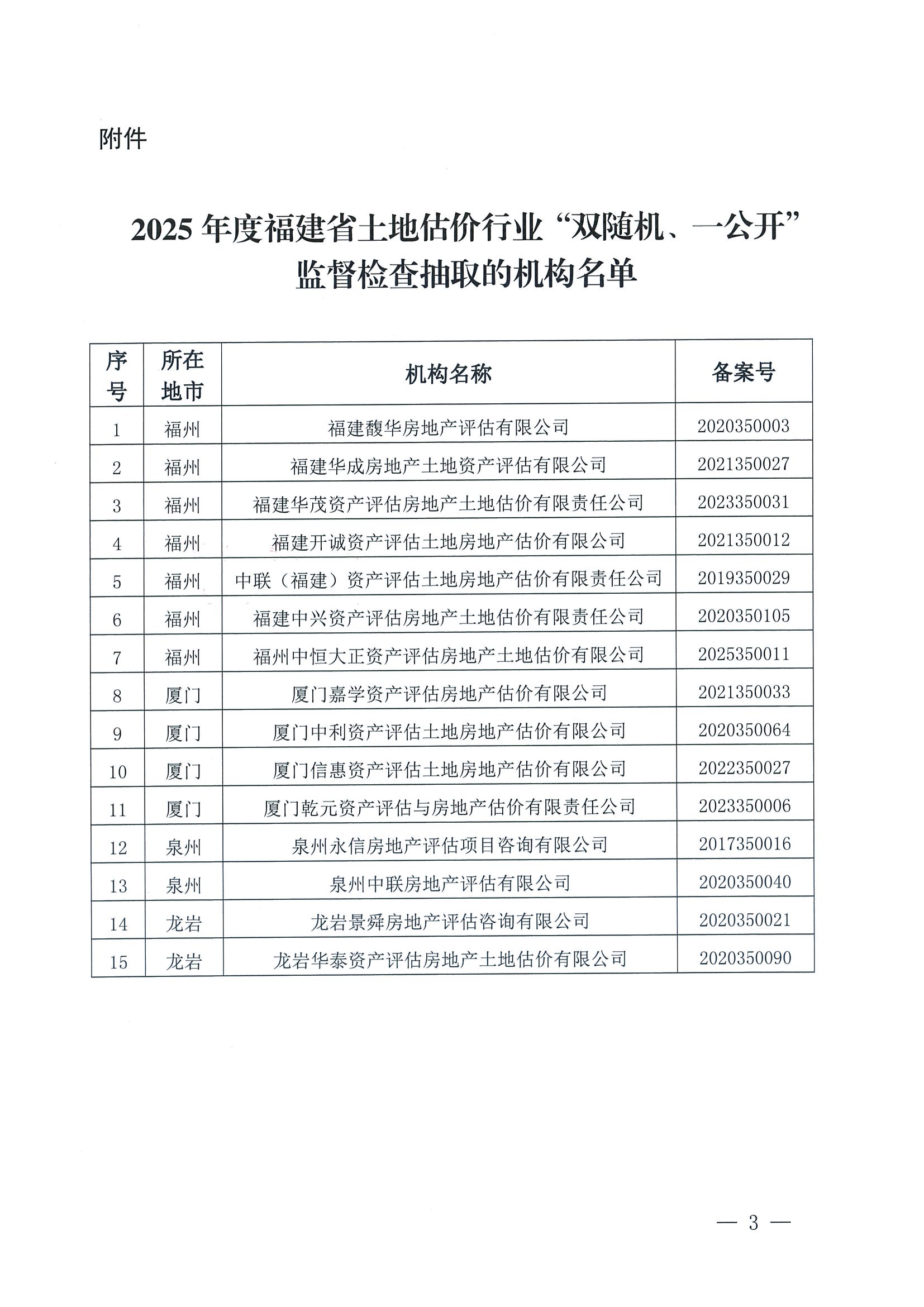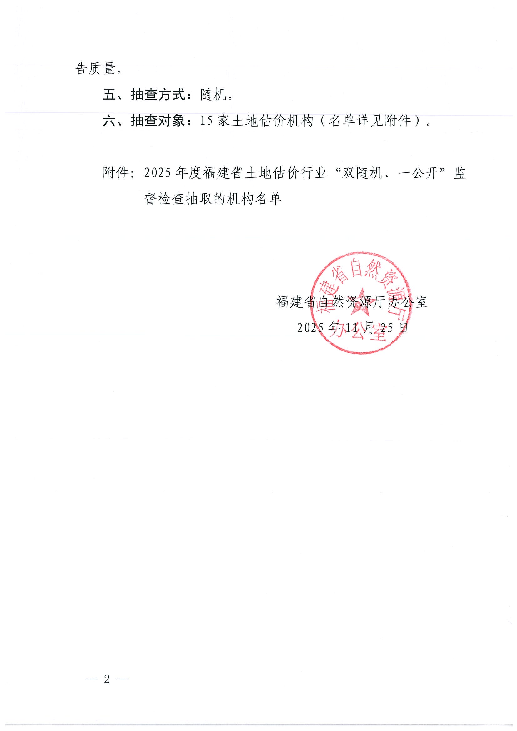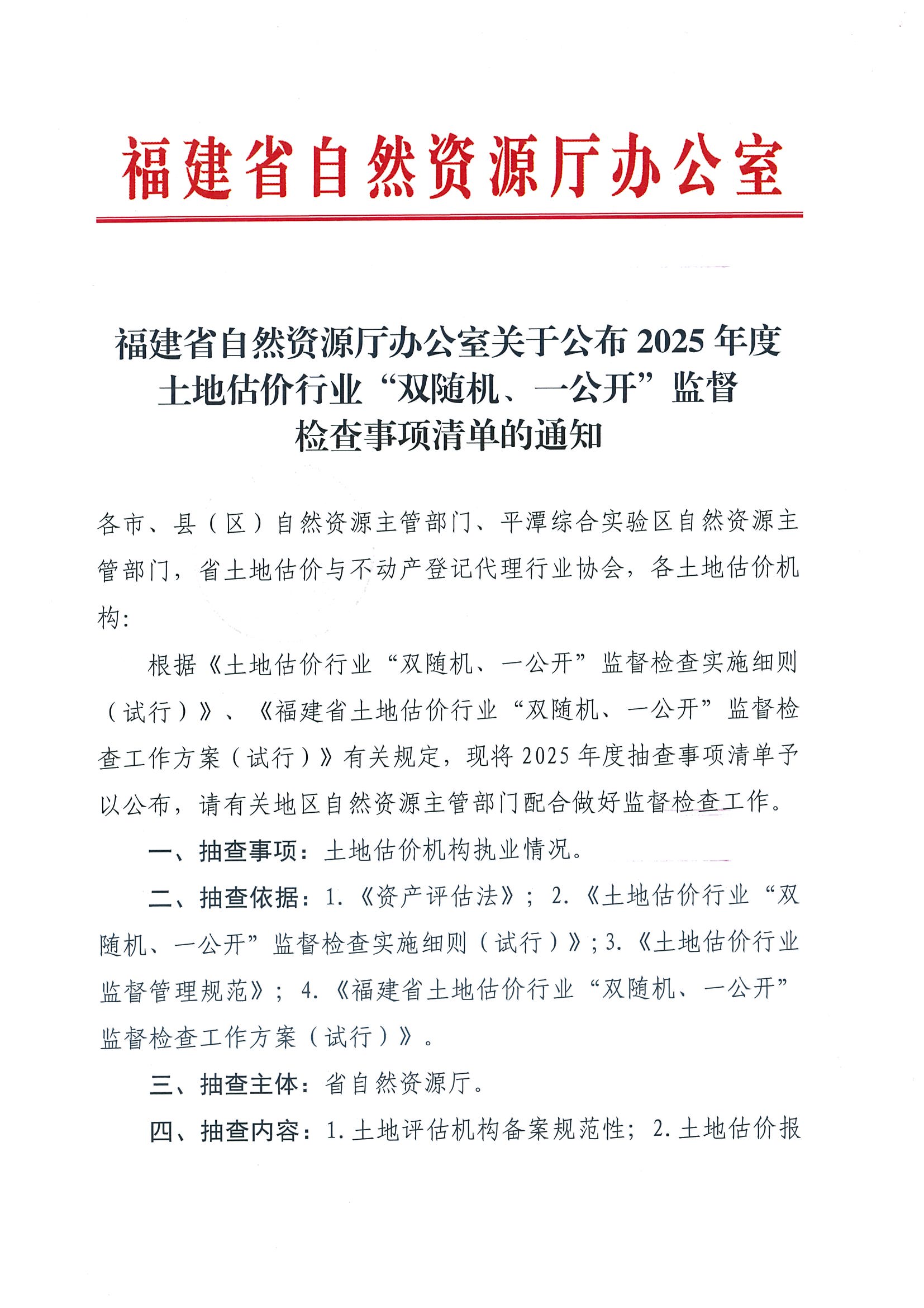 福建省自然资源厅办公室关于公布2025年度土地估价行业“双随机、一公开”监督检查事项清单的通知