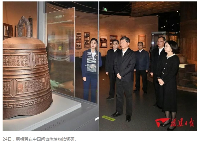 中国闽台缘博物馆是以反映海峡两岸历史关系为主题的国家一级博物馆,两万多件(套)藏品承载了“两岸一家亲、闽台亲上亲”的历史记忆。周祖翼来到博物馆,察看《闽台缘》《乡土闽台》主题展览,认真听取讲解,不时驻足细看,询问有关情况并提出具体要求;走进闽台寻根溯源服务交流中心,了解台胞寻根的感人故事。周祖翼说,要牢记习近平总书记的殷切嘱托,聚焦两岸深厚的历史渊源,紧扣闽台密切的地缘亲缘,大力弘扬两岸共同文化,深入探寻闽台“根脉”,进一步做好涉台文物征集、保护、研究、阐释、利用等工作,科学规范管理,创新完善展陈,让公众更全面、更直观、更系统地感受海峡两岸、闽台两地同根同源、血脉相连,生动鲜活地讲好中国故事、两岸故事,吸引更多台湾同胞来闽寻根谒祖、考察参访、共叙亲情,切实把中国闽台缘博物馆打造成为促进两岸融合发展的重要平台。